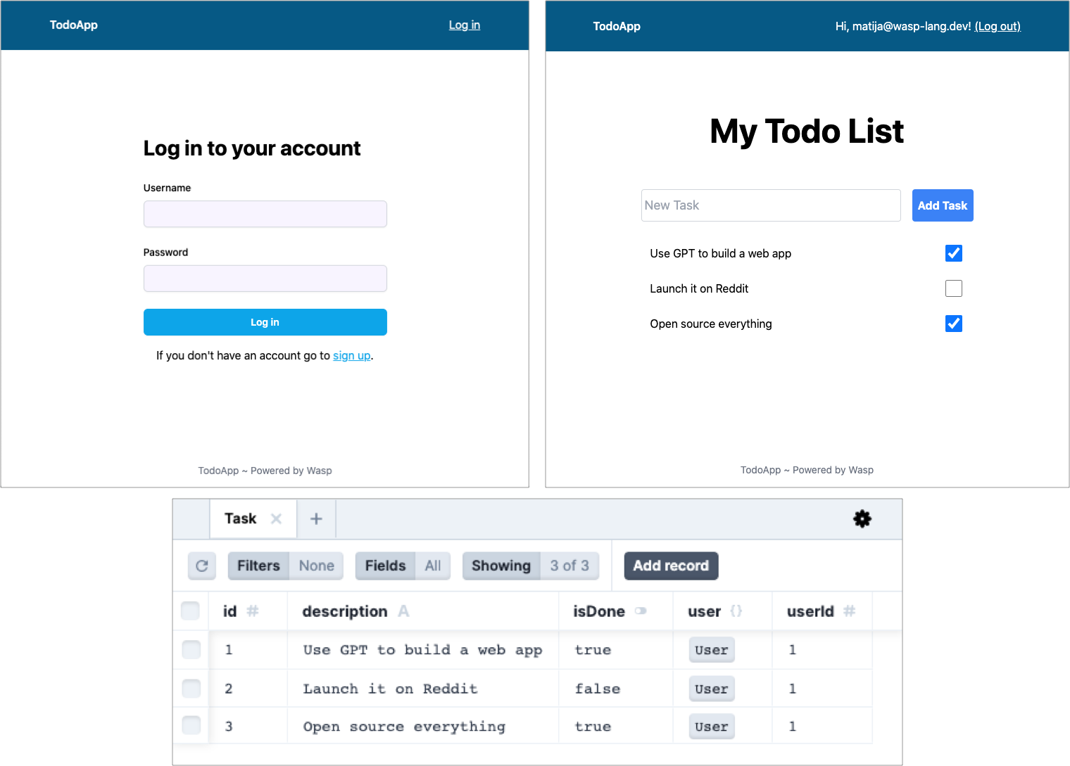 That's it - in a matter of minutes, a full-stack web app codebase, written in React, Node.js, Prisma, and Wasp, will be generated right in front of you, and available for you to download, run it locally and deploy with a single CLI command!